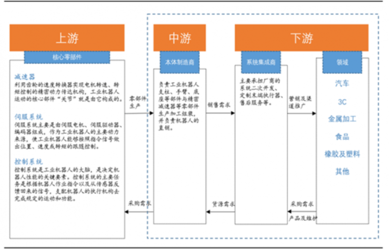 工业机器人产业链主要包括下游系统集成、中游本体制造和上游核心零部件(主要是减速器、伺服系统、控制系统)。从市场规模来看,下游系统集成和中游本体的市场规模相对较大,而上游零部件只有百亿级别;从国产化替代进程来看,下游和中游的国产替代水平相对较高。