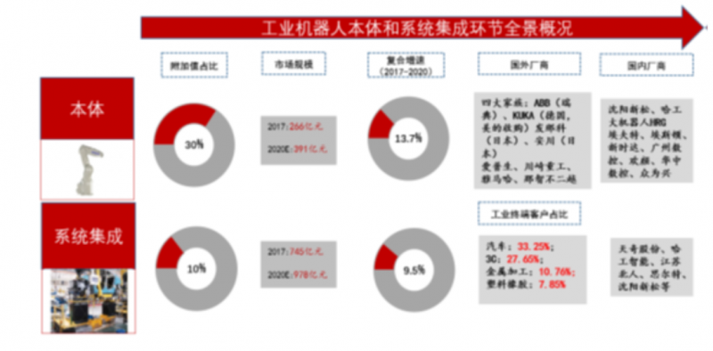 新松等优秀企业,未来进口替代空间广阔。2017 年本体和系统集成的市场规模分别为 266、745 亿元,预计 2020 年二者的市场规模有望分别达到 391 和 978 亿元,2017-2020 年年均复合增速分别为13.7%和 9.5%。