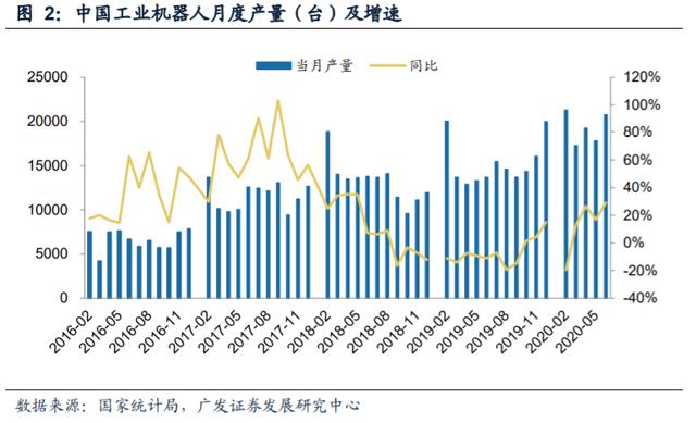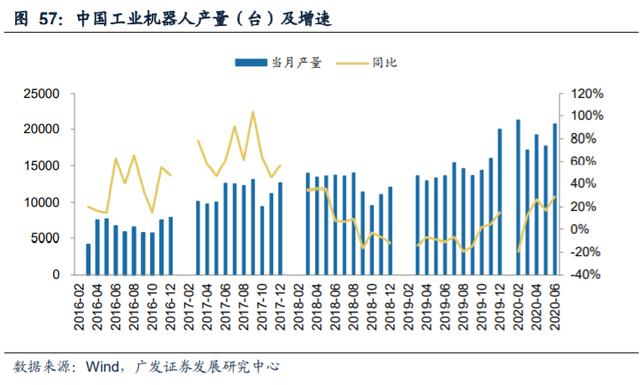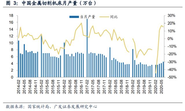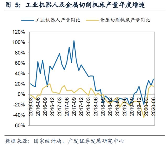 中游设备需求方面,根据国家统计局的数据,2020年6月,我国单月工业机器人产量20761台,同比增长29.2%,延续自去年10月份以来的增长趋势;1-6月工业机器人累计产量93794台,同比增长10.3%。根据国家统计局的数据,2020年6月我国金属切削机床产量4.5万台,同比增长15.4%,1-6月产量20.5万台,同比下滑7.7%。