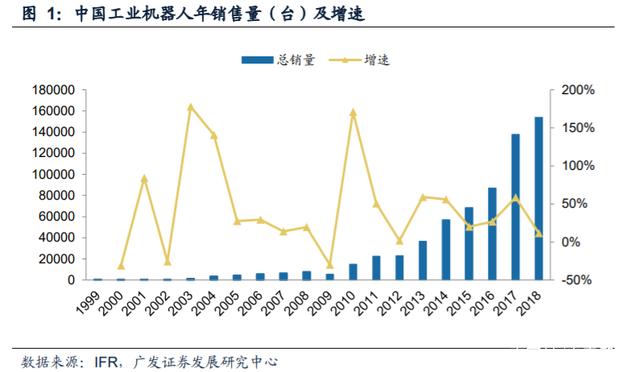 历史上,中国工业机器人的发展经历了三个时期:2008年之前,工业机器人处于萌芽期,每年的产量在一千台左右,属于自动化改造的初始阶段;以2010年为节点,年产量迈入万台大关,2013年以后连续5年成为全球最大市场。根据IFR的数据,2018年我国工业机器人销量15.4万台,同比增长11.68%,占全球总销量的比例约37%。