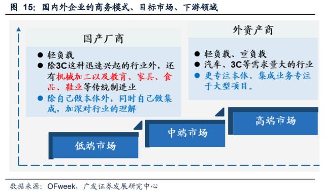 在具体的应用领域方面,外资和国产厂商存在一定的市场划分,外资厂商在重负载和精度较高的轻负载领域优势较大,并且重负载应用领域汽车、3C等行业利润较高、规模较大;而国内厂商只能在外资还未切入的领域发展,比如机加工、家具、食品饮料等行业。基本上外资厂商集中在高端市场,而国内厂商则集中在中端乃至低端市场,更有部分国内厂商选择通过订制非标准产品来扩大规模。