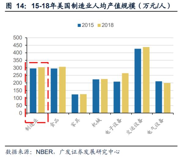 与国外发达国家相比,我国的人均产值仍然有很大的提升空间。根据NBER的数据计算,2018年美国制造业人均产值达到298万人民币/人,接近中国制造业的3倍。具体到细分行业,中美在汽车制造业的生产效率相差最多,其中美国交通运输设备人均产值438万元/人,领先中国175万元/人,主要在于汽车行业是世界上最先引入自动化的产业;而这种差距在家具制造业的表现最不显著,主要是由于家具行业个性化定制占主导成分,人工成本为主要成本来源。