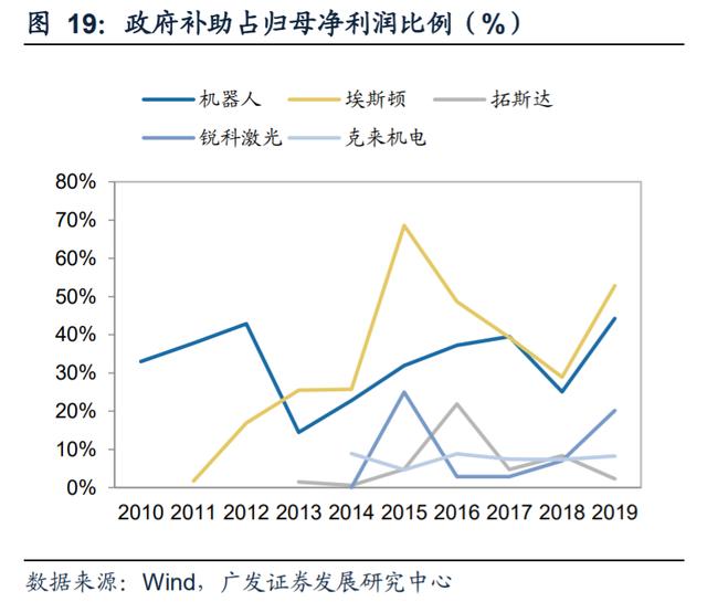 政府补贴对企业的帮扶力度较大,以新松机器人为例,2010年至今平均每年收到的政府补助占净利润的比例在32.88%,其中在12及19年超过了40%。同样的,一体化企业埃斯顿在上市初期也得到了较多的政府补贴支持,12年至今平均政府补助的比例达到38%,为以重资产经营为主、面临价格战压力的机器人企业缓解了现金流压力。在政府补助的倾向性方面有侧重,其中,补贴集中在本体及零部件企业上,对于系统集成商的补贴要略弱。