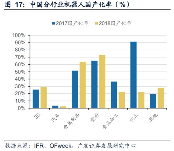 在国产化率方面,根据OFweek的数据,汽车行业国产化率仍处于低点, 18年相较于17年更是有一定的下滑,从3.4%下降为2.5%。3C电子行业国产化率有一定的提升,主要来源于3C新产品的开发、新产线的升级等带来的需求,该部分需求由国产厂家承接。而在机加工和其他领域,国产化率都有接近10个pct的提升,证实了我国国产机器人企业通过开拓细分领域市场来促进订单需求的事实。