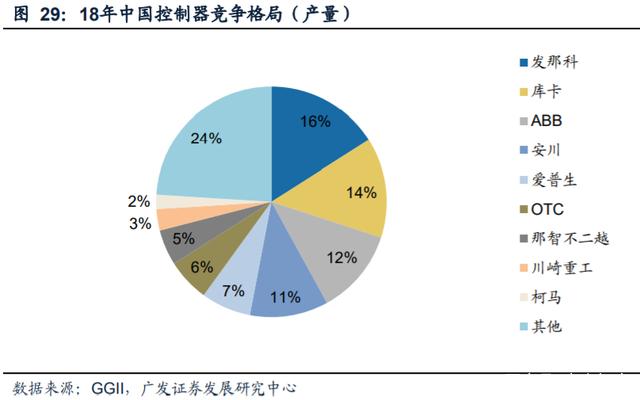 控制器:控制器在硬件上并无太高门槛,但要保证与本体的适配性,所以其份额与本体的格局几乎一致,导致国内企业尚未形成竞争优势。根据GGII的数据,2018年发那科、安川、ABB产量占据53%的份额,二线企业产量占据23%的份额。