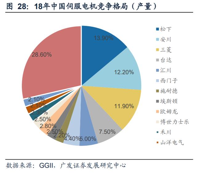 伺服电机:整体行业格局随机器人行业的扩张而不断扩展,当前机器人占伺服电机应用量的9%。行业仍以日系品牌和欧美系品牌为主,16-18年汇川技术中国产量市占率由3%提升为了5%,埃斯顿则基于机器人本体份额的提升以及伺服系统技术积累的优势,18年中国产量市占率达到2.5%。在突破路径上,国内伺服企业选择通过开拓小规模、新应用市场提高自身产能规模,形成技术迭代后再与外资竞争。