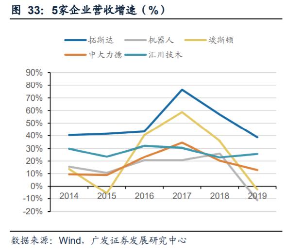 我们选取减速器中大力德、伺服系统汇川技术、机器人本体埃斯顿和机器人以及集成商拓斯达,共五家企业做对比分析。