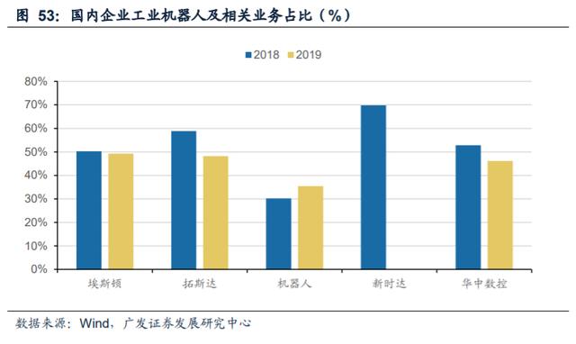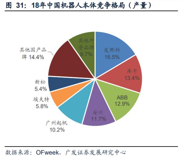 本体:根据高工机器人的数据,2018年四大家族在国内产量的市场份额约54.5%,国际二线品牌柯马、史陶比尔、那智不二越也有10%的份额。国内企业主要以新松、埃夫特、埃斯顿和广州起帆为主,这几家国内龙头市占率实现了不同程度的提升。市场资源的开拓、核心技术的领先和迭代、整体产业链的整合共同导致了国内企业如大浪淘沙,强者愈强的本质凸显。另外,外资和国产厂商存在一定的市场划分,外资厂商在重负载和精度较高的轻负载领域优势较大;而国内厂商侧重在外资还未大规模切入的新兴领域发展,比如机加工、新能源、家具、食品饮料等行业。