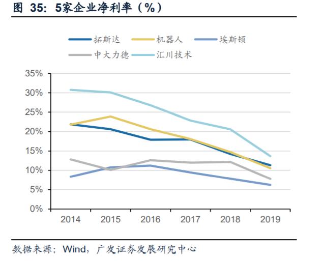 在企业规模及成长性方面,15-19年各企业收入增速经历了先升后降的趋势。其中以机器人、埃斯顿为代表的本体制造商在周期内增速提升最为显著,本体企业由于处于行业中游位置,同时受益于下游需求改善和政策主导利好,在周期内显示弹性要超过零部件企业和系统集成商。