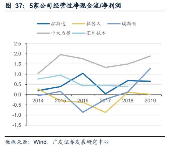 但大多数企业现金流情况有待改善。在15-17周期内,本体企业机器人和埃斯顿现金流情况大多为负数,主要是因为本体企业为了迅速扩大生产,回款相对较差,而后者在需求较差的19年主动收紧回款制度,现金流情况有所改善,而拓斯达的现金流波动幅度较大,我们认为集成商提供的解决方案订单周期相对较长,部分项目确认存在波动,对于现金流、业绩形成扰动。