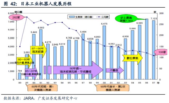 日本工业机器人产业大致分成三个阶段:1.初入阶段(1967-1991),该阶段日本工业由于国内经济快速增长,劳动力大量不足,制造业企业对工业机器人需求极高。2.IT成熟阶段(2002-2005),随着信息技术、编程技术的提升,工业机器人能替代人工进行的操作进一步提升,智能化趋势加深。3.海外市场拉动阶段(2013-今),该阶段随着中国对高端、智能制造的追求,企业自动化变革动力提高,日本工业机器人大量出口中国。