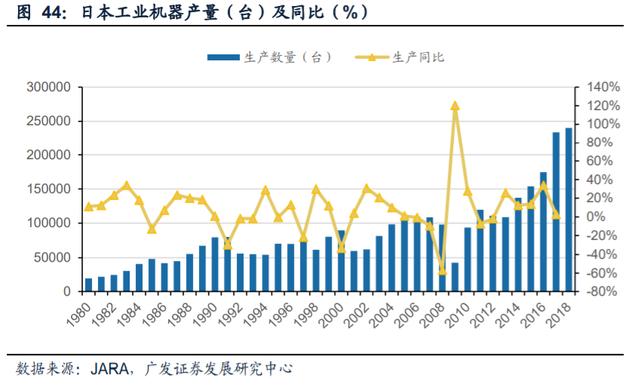与日本工业机器人发展相对应的是日本制造业劳动力人口的下降,同时在初入阶段过去,日本整体经济进入“失去的三十年”周期,工业机器人产销量仍然是处于快速增长阶段,这在一定程度上反映了工业机器人等自动化产品不仅存在着机器换人的逻辑,更是企业提升生产率和产品质量的助力。
