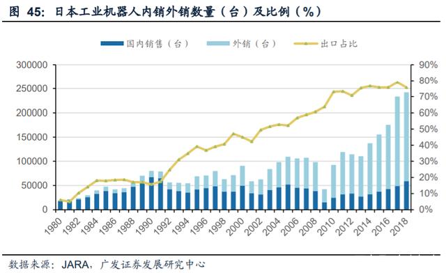 在日本国内需求固定的情况下,出口成为了日本工业机器人的主要销售出路。根据JARA的数据,1980年日本机器人外销占比仅为6.02%,2018年日本机器人外销占比提升至75.60%,从13年开始,外销台数基本以每年2万台数量上升。其中大多销售往中国,在一定程度上,中国市场的自动化改造带来了日本工业机器人行业的一轮新春。
