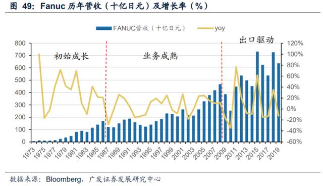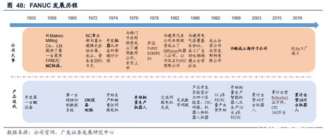Fanuc的发展主要可以分为3个阶段:1.1973-1986年初步成长,公司基本完成了所有业务产品的布局;2. 1986-2008业务逐步成熟,公司扩展加深了产品线,不断的扩充市场并且完成海外销售及子公司布局;3.市场驱动阶段:公司在CNC数控及工业机器人领域已做到行业龙头地位,并且在世界大多数国家和地区建立销售网络。