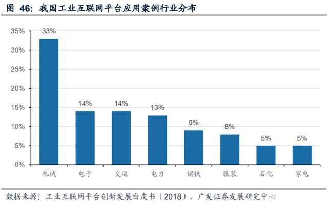 根据《工业互联网平台创新发展白皮书2018》的数据,分行业来看,自动化程度高、应用价值较大且设备占比较高的行业中工业互联网渗透更快。机械、电子、交运、电力合计占据74%的应用案例。其中,电力、电子行业受益于新兴产业信息化程度较好,而钢铁、石化、机械等行业则主要受益于资本密集,下游资金投入意愿较高。总体来说,自动化程度较高和固定资产投资意愿较高的行业愈发会受益于工业互联网带来的生产效率、产品质量的提升红利。
