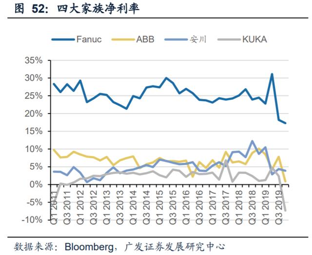 在营运质量方面,Fanuc利润率水平很高,根据年报的披露,Fanuc相比ABB、安川、KUKA的利润率高10 pct以上,反哺研发投入和产品升级,形成良性循环。