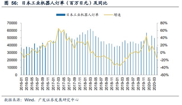 海外市场,日本工业机器人订单增速自去年2月份以来呈现探底回升的趋势,去年9月增速转正以来持续提升,但受到疫情的影响,今年5月份开始出现回落。根据日本经济产业省的数据,2020年5月日本工业机器人订单377.6亿日元,同比下滑15.68%。整体来看,日本工业机器人景气度在提升,主要受到中国的影响,但因疫情在海外的持续发酵,其需求存在一定的不确定性。海外需求与国内出现背离。